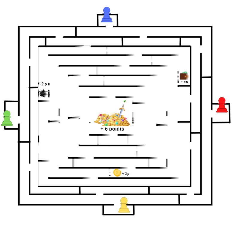 Ce labyrinthe contient 4 entrées différenciés par des pions de couleur. Un seul chemin mène à la salle des trésors qui contient 6 points.