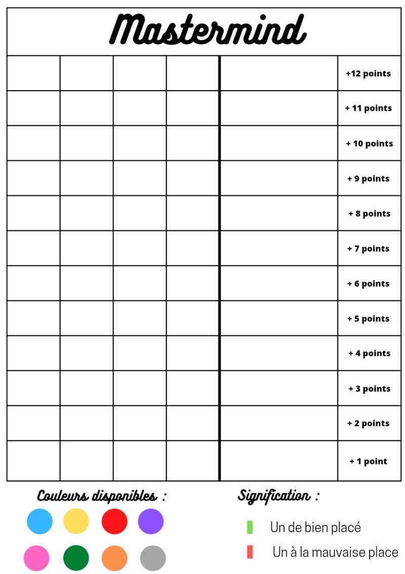 Aujourd'hui, vous allez devoir retrouver le code composé de 4 couleurs qui ouvre le trésor garni de 12 points mais attention un petit singe farceur a fait un trou en dessous du coffre et retire un point à chaque fois que vous essayez un nouveau code.