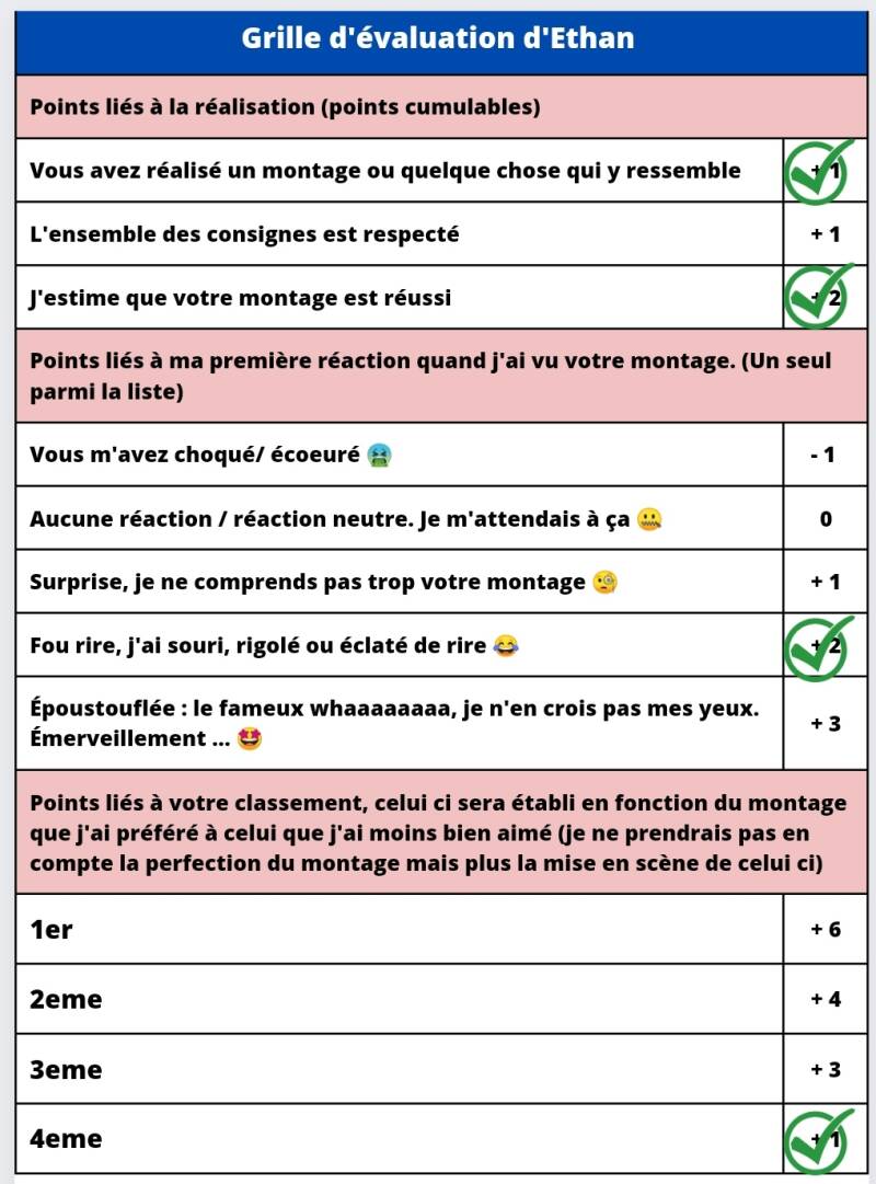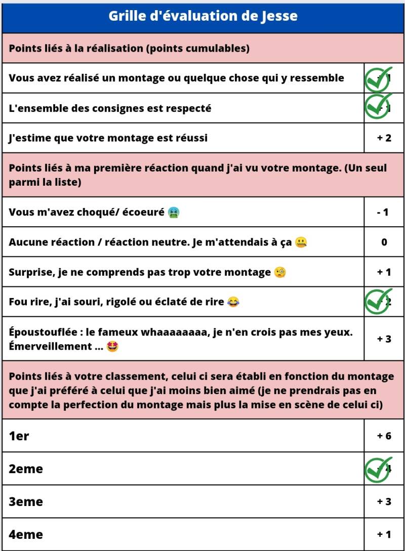 Appréciation : Merci pour ce moment de fou rire. Le montage est loin d'être parfait mais ça marche tellement bien que j'ai hésité à t'accorder les points de réussite du montage.